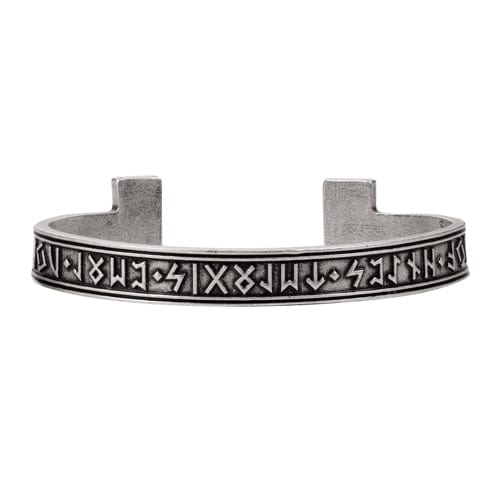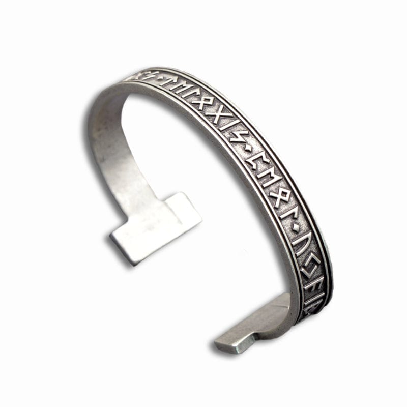 Le bracelet alphabet futhark dit le système entier au poignet — toutes les runes du Elder Futhark gravées en série autour du bras, comme une inscription complète qui accompagne chaque geste. Porter tout l’alphabet runique au poignet dit la maîtrise du système : non pas une rune choisie pour sa signification particulière mais le système entier, dans l’ordre, de Fehu à Othala (ou Dagaz), chaque rune à sa place dans la séquence. La séquence complète du futhark dit le runologue qui a mémorisé l’alphabet entier, qui porte sur son bras ce qu’il a appris par cœur.
